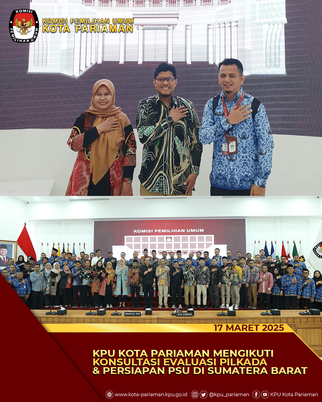 Ketua KPU Kota Pariaman, Ali Unan, S.Kom, bersama Anggota KPU Kota Pariaman Divisi Perencanaan, Data, dan Informasi (Perdatin) Afriwaty Zen serta Kasubag Keuangan, Umum, dan Logistik Suhelman turut serta dalam konsultasi dengan KPU RI pada 17 Maret 2025.