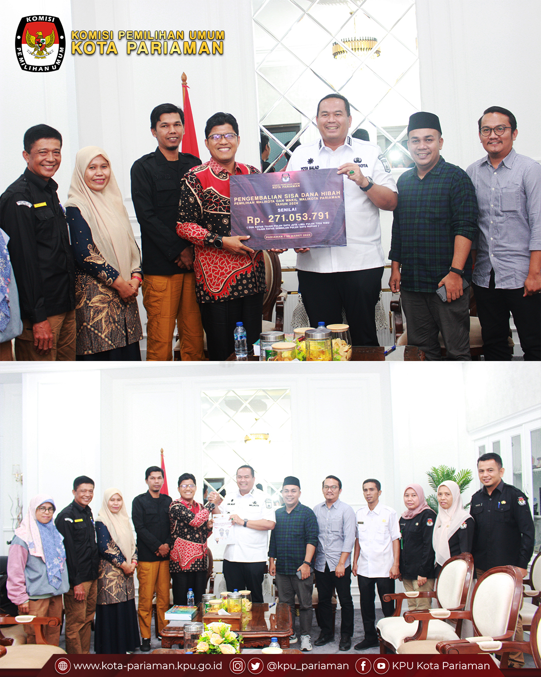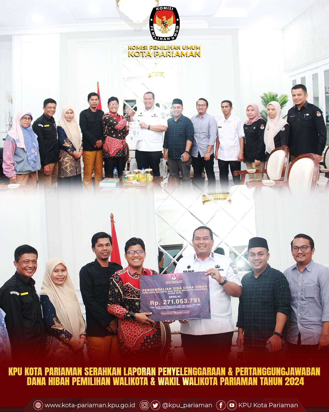 Laporan ini diterima langsung oleh Walikota Pariaman di ruang kerja beliau, sebagai bentuk akuntabilitas dan transparansi KPU dalam pengelolaan anggaran hibah Pilkada. Dalam kesempatan tersebut, KPU Kota Pariaman juga mengembalikan sisa dana hibah kepada Pemerintah Kota Pariaman sebagai wujud komitmen terhadap efisiensi penggunaan anggaran.