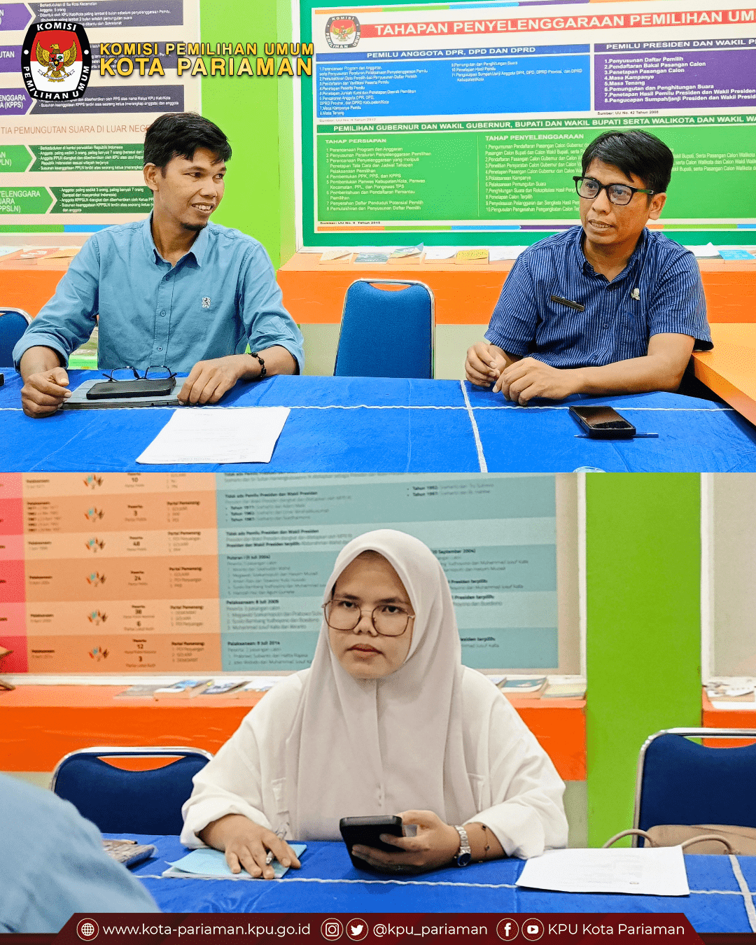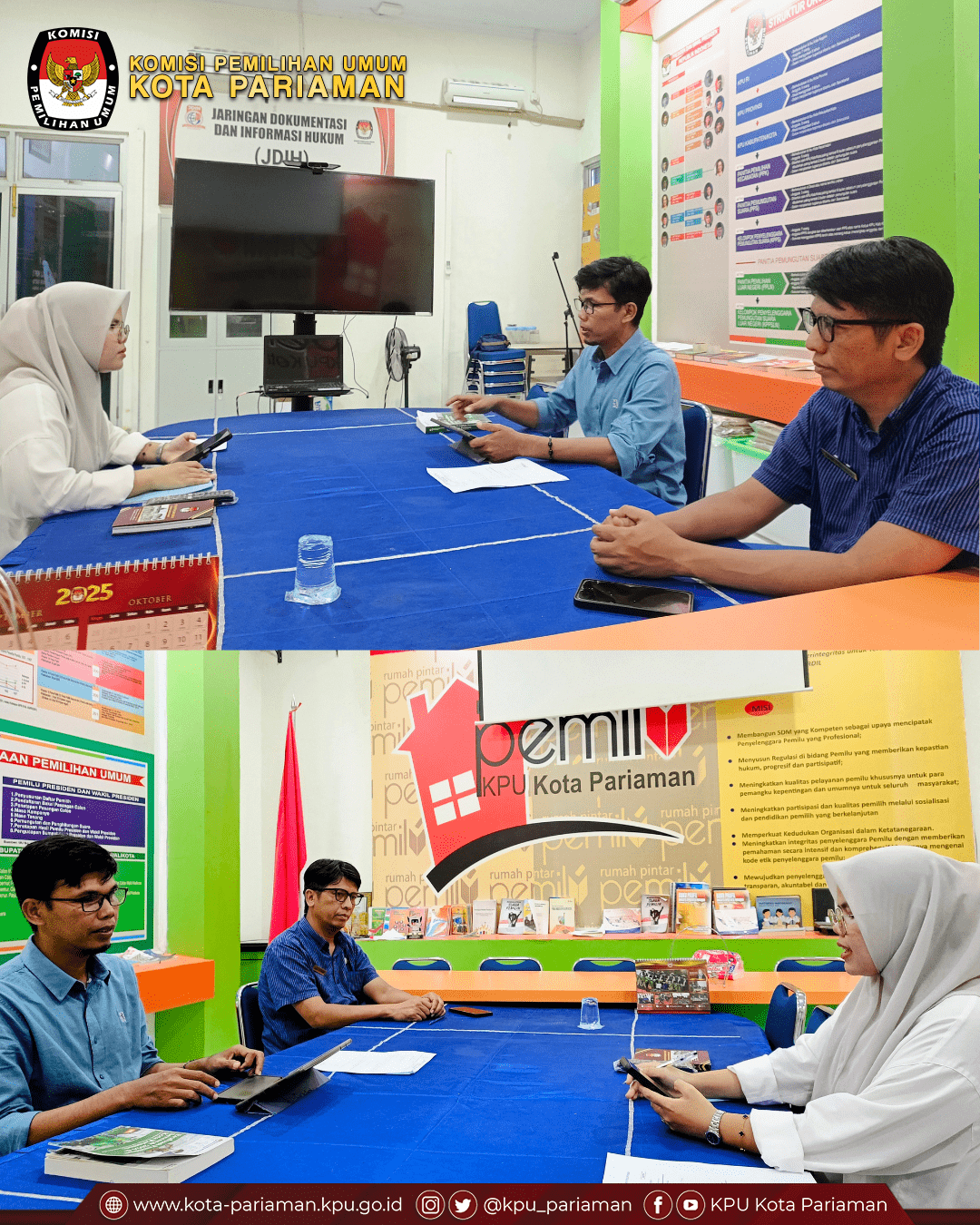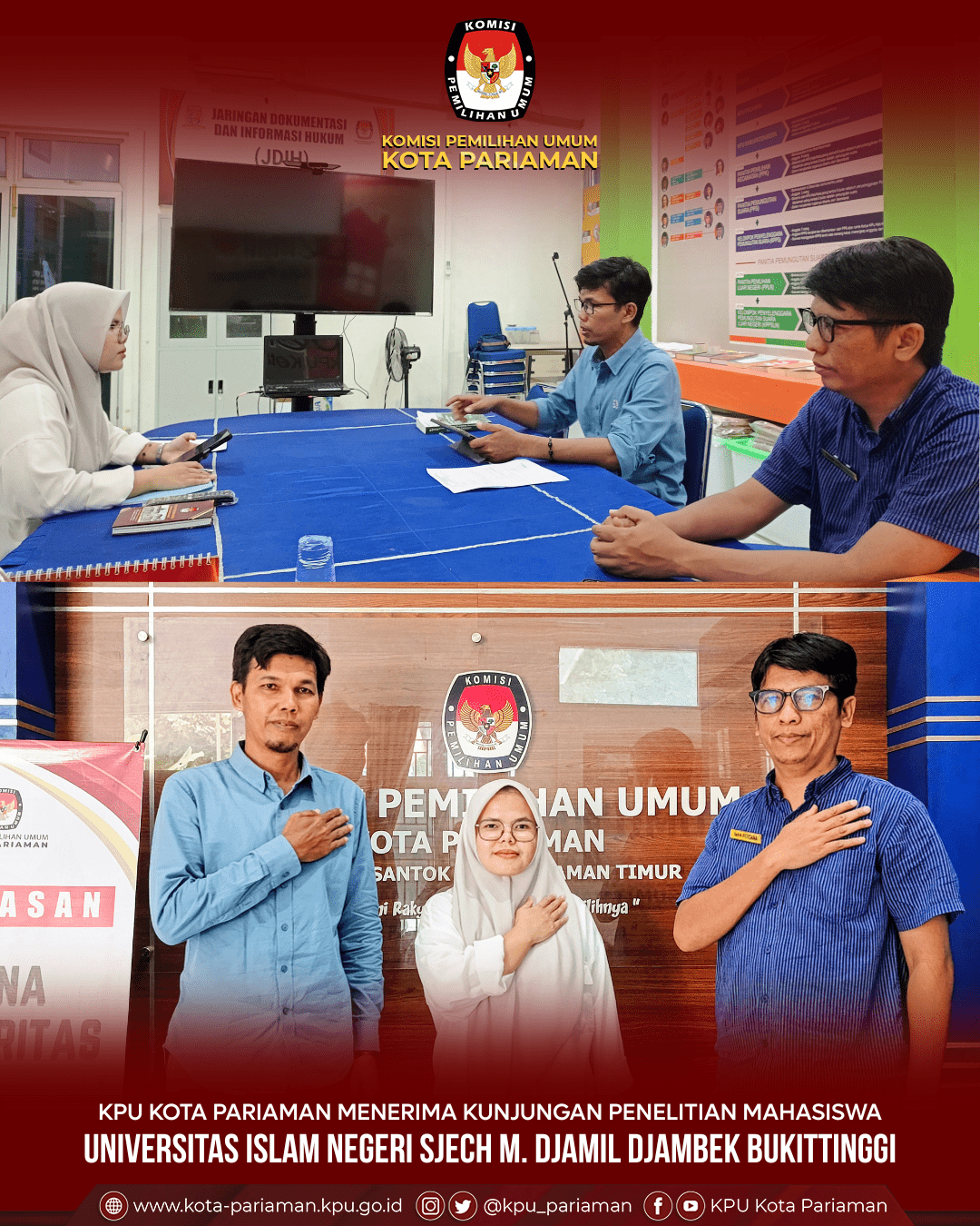 KPU Kota Pariaman melalui Kepala Divisi Partisipasi Masyarakat dan SDM, Fitra Yandi, S.Pd, bersama Kasubag Partisipasi Masyarakat dan SDM, Iwan Perdana, S.Kom., MM, menerima kunjungan penelitian dari mahasiswa Universitas Islam Negeri (UIN) Sjech M. Djamil Djambek Bukittinggi.
