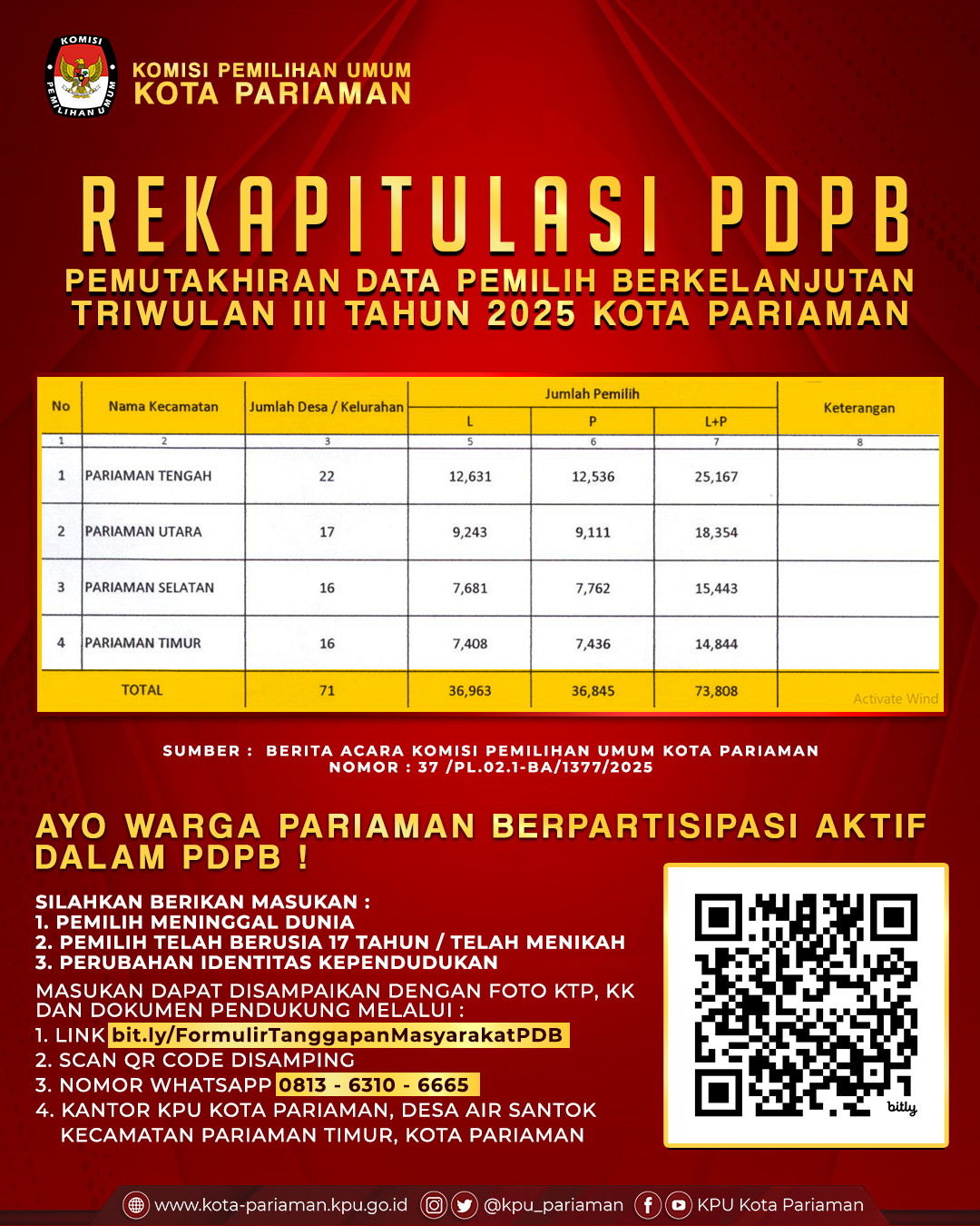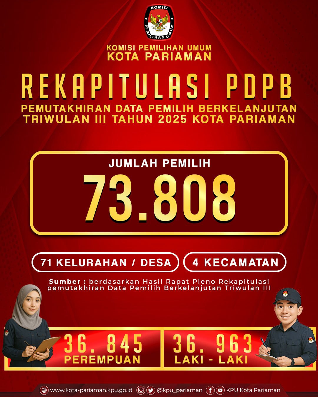 Jumlah pemilih di Kota Pariaman hasil Pemutakhiran Data Pemilih Berkelanjutan (PDPB) Triwulan III Tahun 2025 telah dirilis.