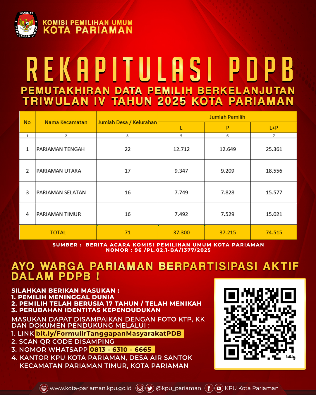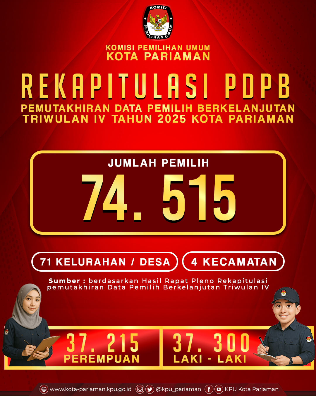 KPU Kota Pariaman telah melaksanakan Rapat Pleno Rekapitulasi Pemutakhiran Data Pemilih Berkelanjutan (PDPB) Triwulan IV Tahun 2025 dan menetapkan jumlah pemilih sebanyak 74.515 jiwa, yang terdiri dari 37.300 pemilih laki-laki dan 37.215 pemilih perempuan, tersebar pada 4 kecamatan dan 71 desa/kelurahan di Kota Pariaman. Rekapitulasi ini merupakan bagian dari komitmen KPU Kota Pariaman dalam memastikan data pemilih yang akurat, mutakhir, dan berkelanjutan untuk mendukung penyelenggaraan Pemilu yang semakin baik.