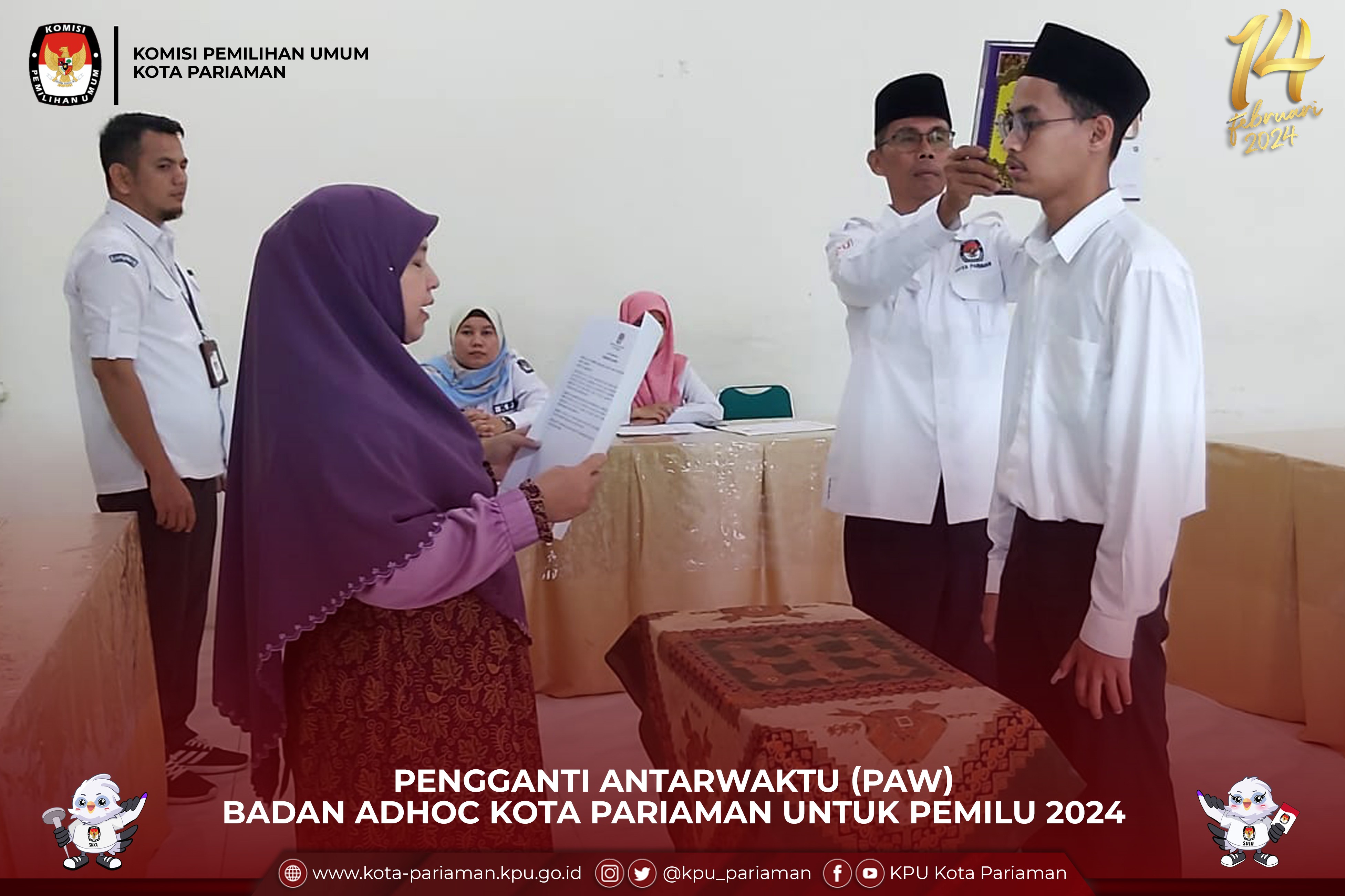 Pariaman, kota-pariaman.kpu.go.id - Ketua KPU Kota Pariaman, Aisyah, melantik 213 orang anggota Panitia Pemungutan Suara (PPS) yang berasal dari 71 Desa/Kelurahan yang ada di Kota Pariaman pada Selasa, 24/01/2023. Kegiatan yang dilaksanakan di Balaikota Pariaman itu dihadiri oleh Walikota Pariaman, Genius Umar, Kapolres Pariaman, Dandim 0308 Pariaman, Kajari, Bawaslu Kota Pariaman, Camat se Kota Pariaman dan undangan lainnya. Dalam sambutannya, Ketua KPU Kota Pariaman meminta anggota PPS yang baru lantik agar langsung bekerja karena tahapan Pemilu 2024 sudah berjalan. “Tanggal 26 ini teman-teman PPS akan mulai merekrut Pantarlih atau Panitia Pemutakhiran Data Pemilih. Selanjutnya mulai tanggal 8 Februari 2023 akan dilakukan coklit atau pencocokan dan penelitian daftar pemilih. Dan tahapan verifikasi faktual dukungan calon perseorangan anggota DPD juga akan mulai dilaksanakan. Jadi tidak ada waktu bagi teman-teman untuk bermain-main”. Ungkap Aisyah. Sementara itu, Walikota Pariaman, Genius Umar, dalam sambutannya meminta PPS yang baru dilantik untuk menjaga profesionalitas dan netralitasnya. “Suksesnya pelaksanaan Pemilu dan meningkatknya kualitas demokrasi di Kota Pariaman ini bergantung pada profesionalitas Bapak Ibu semua. Untuk itu saya berharap Bapak Ibu mampu bersikap profesional dan menjalan tugas sesuai dengan peraturan yang berlaku”. Ujar Genius. Kegiatan pelantikan ini dilanjutkan dengan Apel Kesiapan PPS yang dilakukan di halaman Balaikota dan Bimbingan Teknis Tata Kerja dan Kode Etik anggota PPS. Sebelumnya KPU Kota Pariaman telah melakukan serangkaian seleksi penenrimaan calon anggota PPS sejak tanggal 18 Desember 2023. Melalui seleksi administrasi, seleksi tertulis dan seleksi wawancara, KPU Kota Pariaman akhirnta menetapkan 3 orang anggota PPS per Desa/Kelurahan.