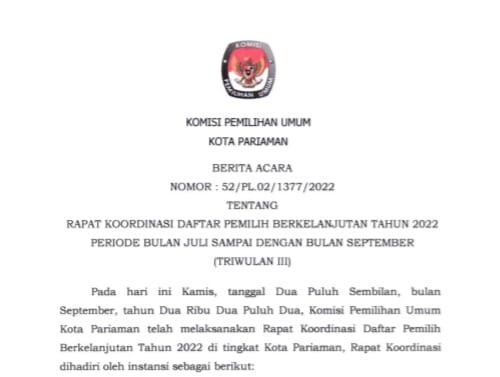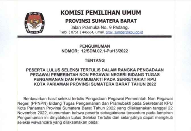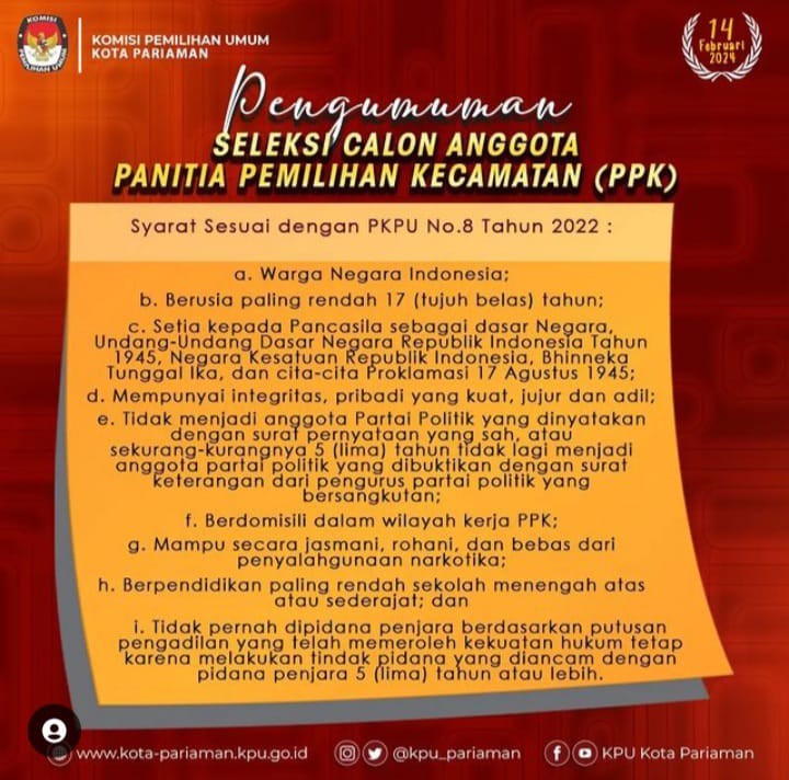 Pariaman, kota-pariaman.kpu.go.id - Komisi Pemilihan Umum Kota Pariaman mengundang Warga Negara Indonesia yang memenuhi persyaratan untuk mendaftarkan diri menjadi Anggota Panitia Pemilihan Kecamatan (PPK) untuk Pemilihan Umum Tahun 2024.