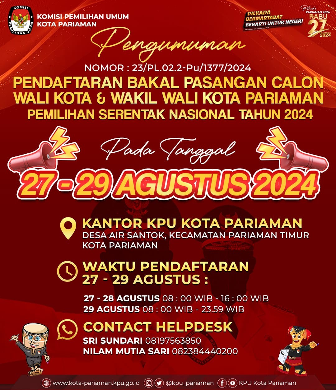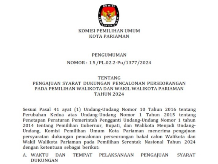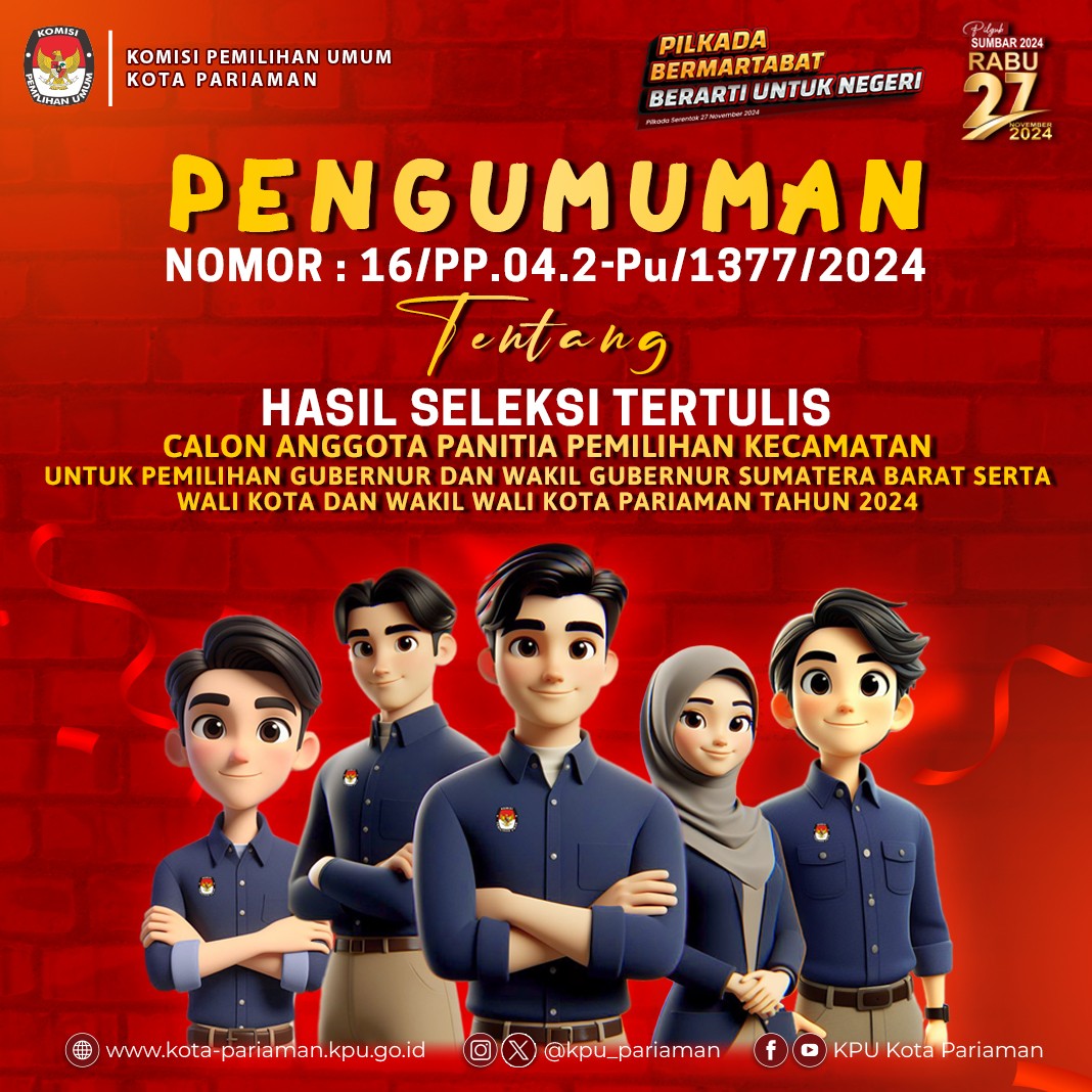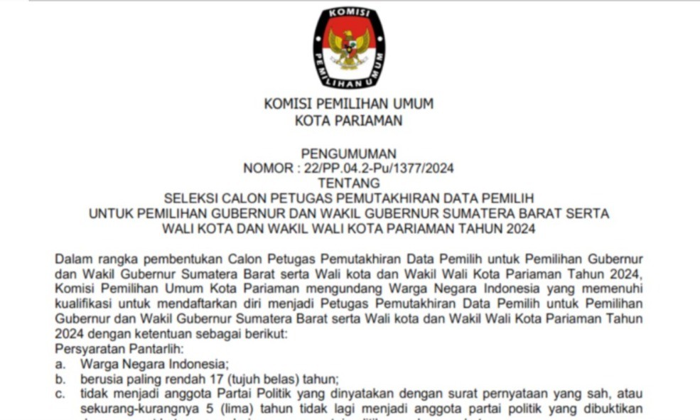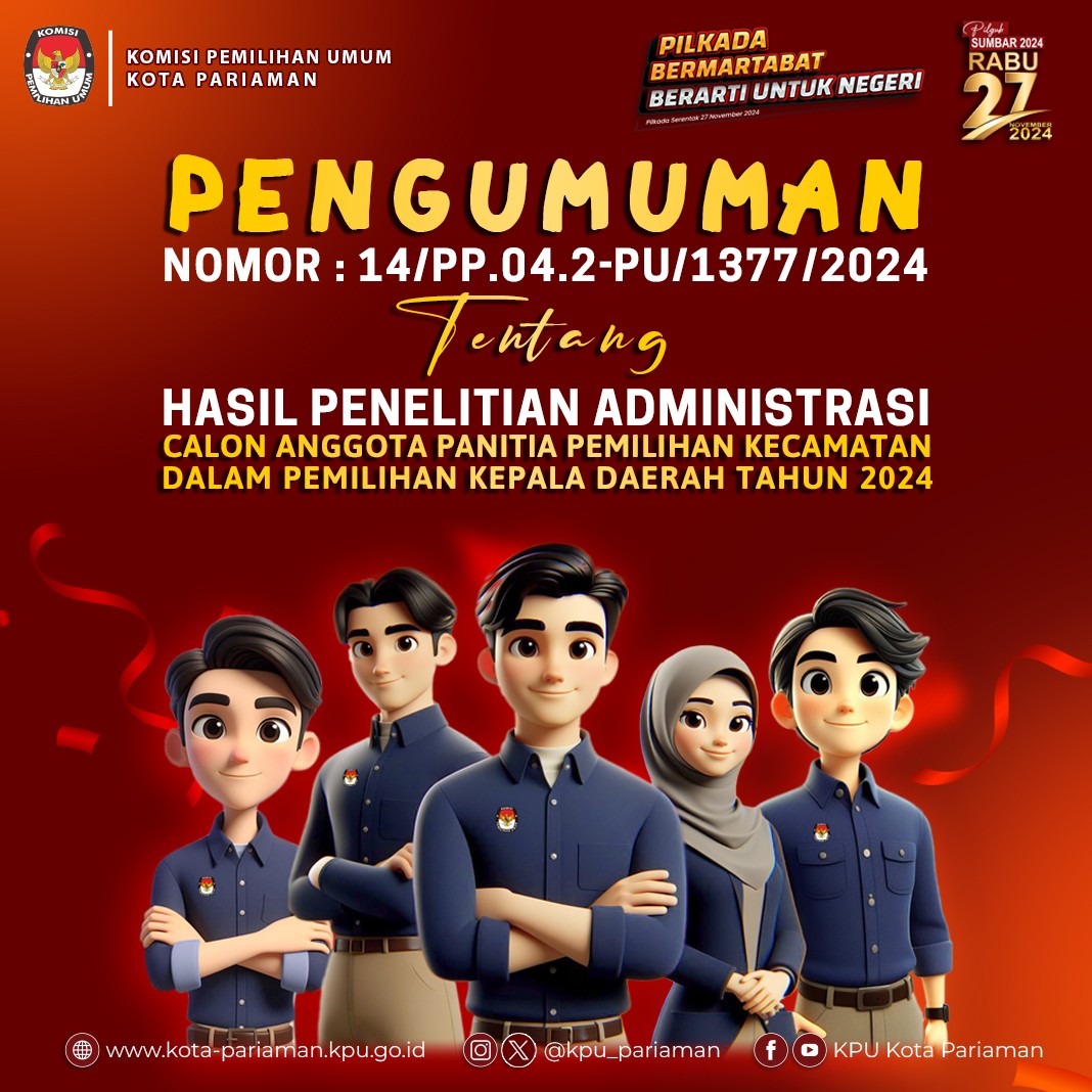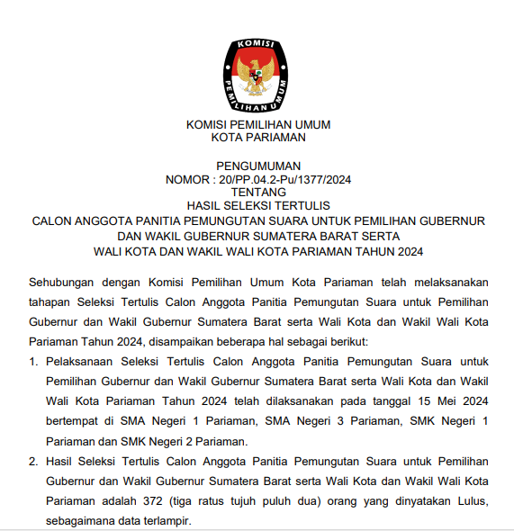 Sehubungan dengan Komisi Pemilihan Umum Kota Pariaman telah melaksanakan tahapan Penelitian Administrasi Calon Anggota Panitia Pemilihan Kecamatan untuk Pemilihan Gubernur dan Wakil Gubernur Sumatera Barat serta Wali Kota dan Wakil Wali Kota Pariaman Tahun 2024, disampaikan beberapa hal sebagai berikut: