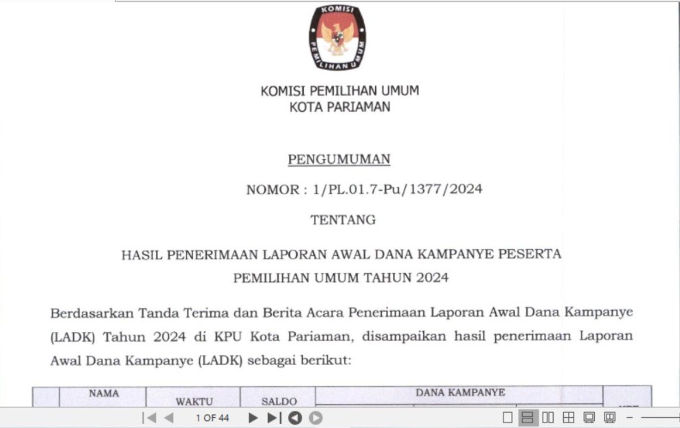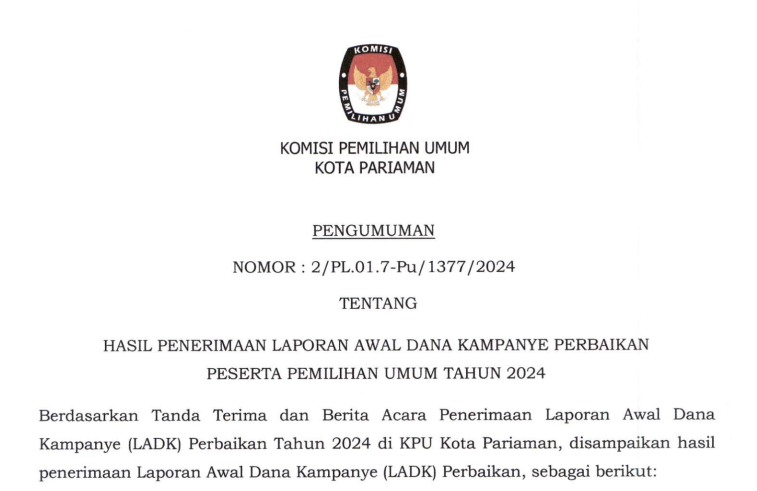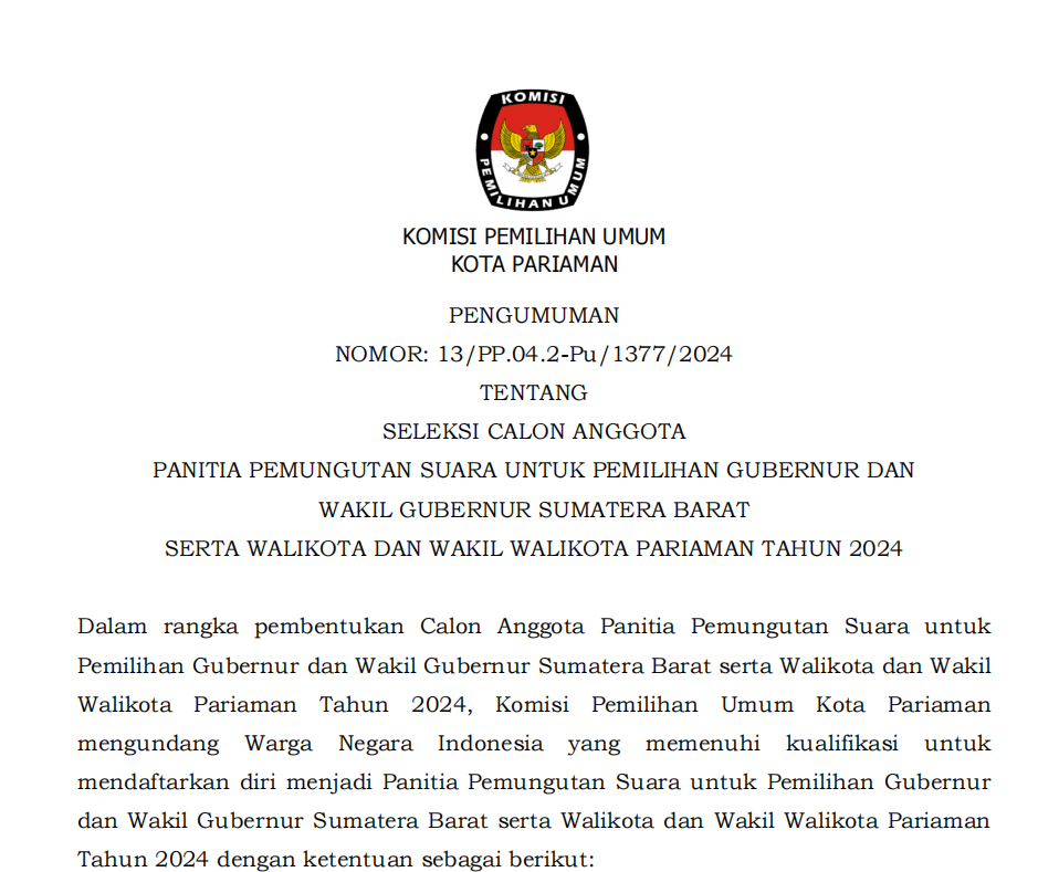 Pengumuman Nomor : 12/PP.04.2-Pu/1377/2024 tentang Seleksi Calon Anggota Panitia Pemilihan Kecamatan untuk Pemilihan Gubernur dan Wakil Gubernur Sumatera Barat serta Walikota dan Wakil Walikota Pariaman Tahun 2024;