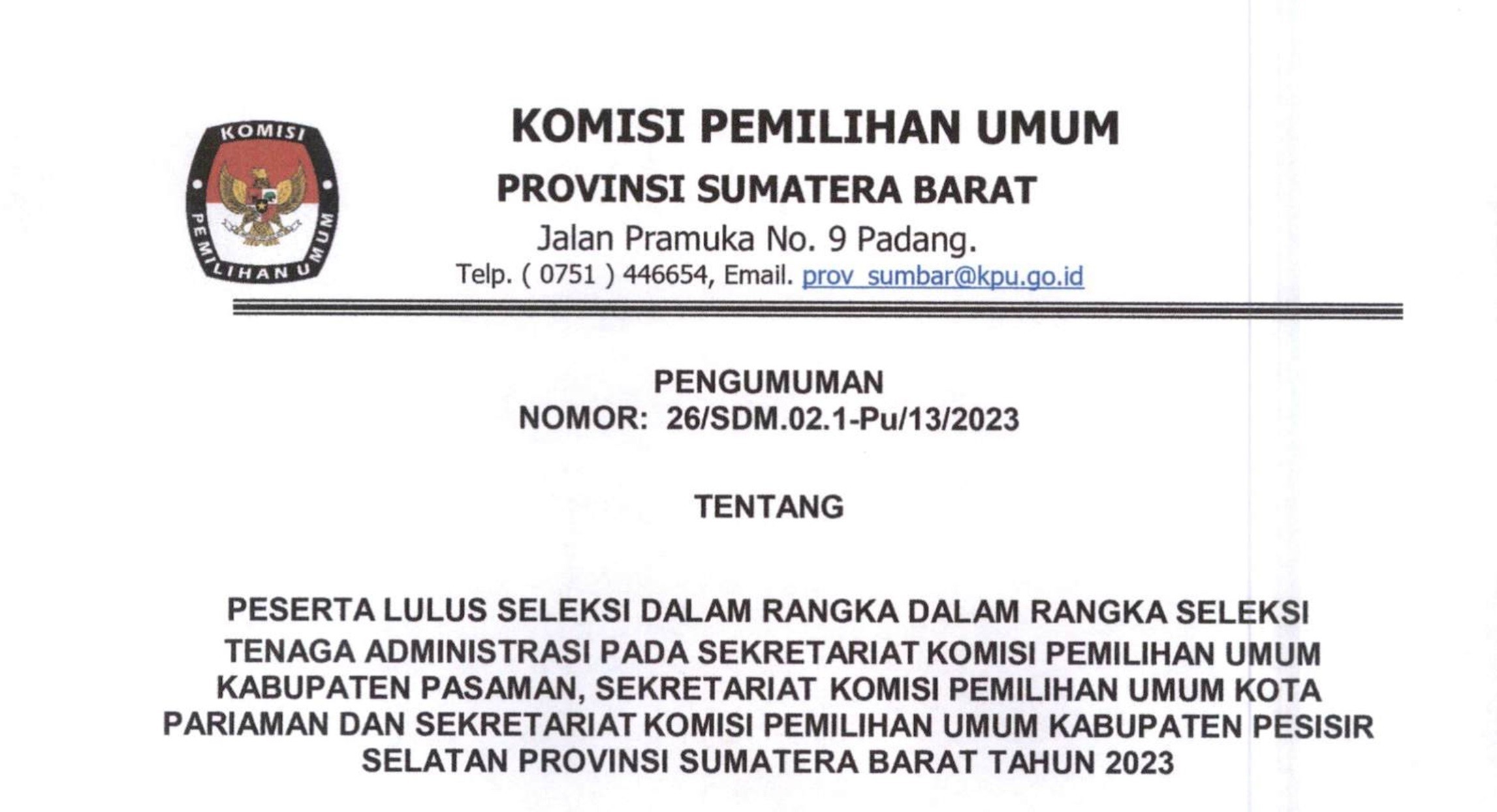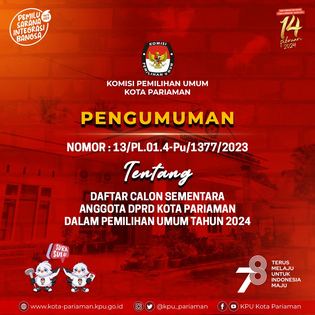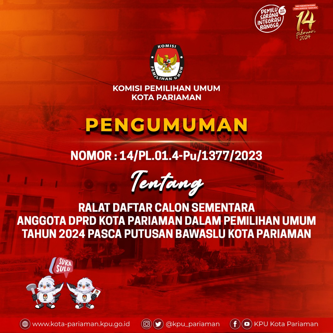 Pariaman, kota-pariaman.kpu.go.id - Berikut ini kami umumkan Ralat Daftar Calon Sementara (DCS) Anggota DPRD Kota Pariaman dalam Pemilihan Umum Tahun 2024 Pasca Putusan Bawaslu Kota Pariaman.
